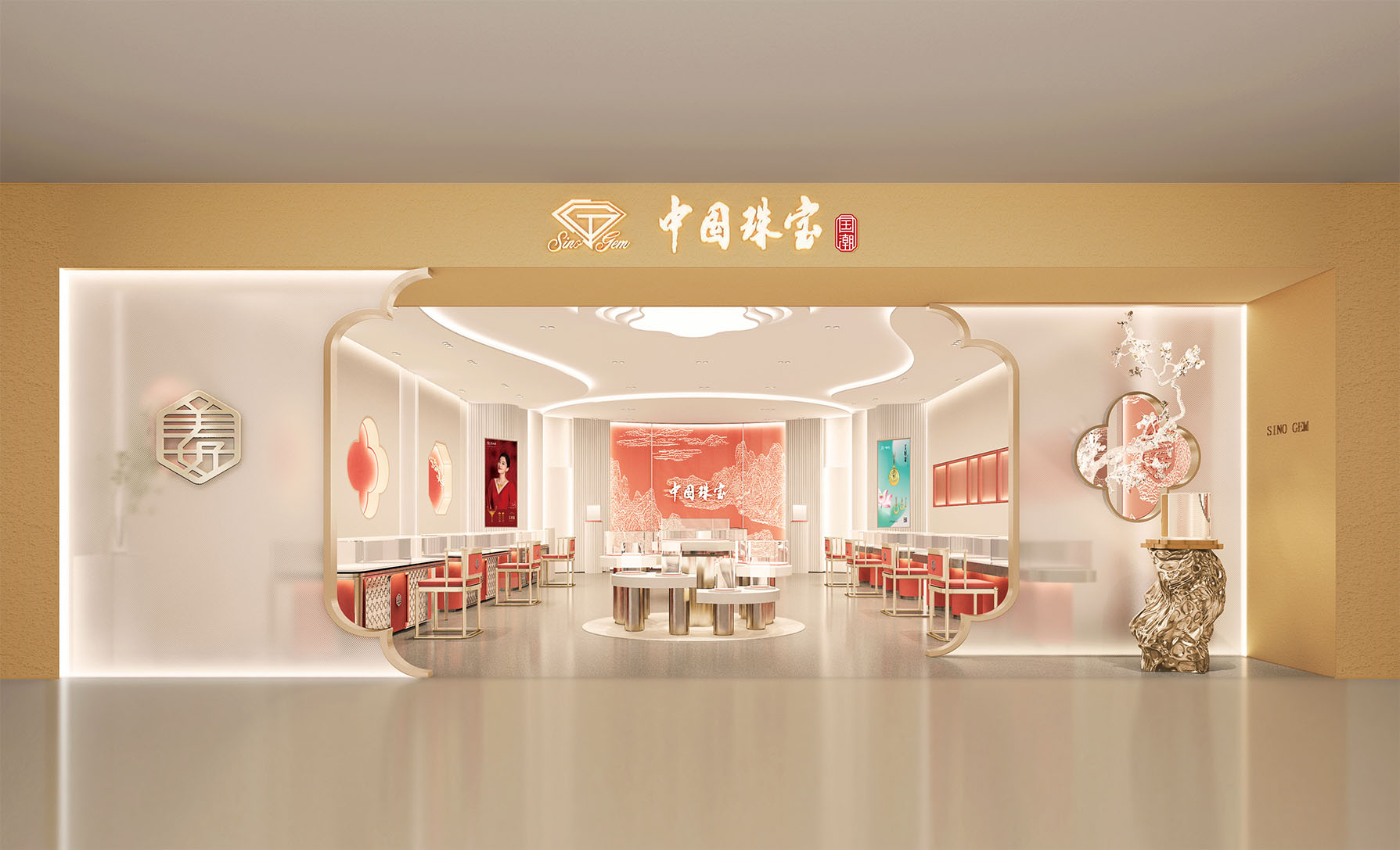 国朝店围绕“中华美学珠”的品牌定位,从中华优秀传统文化中汲取经典设计元素,打造兼具现代审美与东方韵味的门店形象,以雅致、大气、吉祥的新中式国潮风传递品牌美好理念。