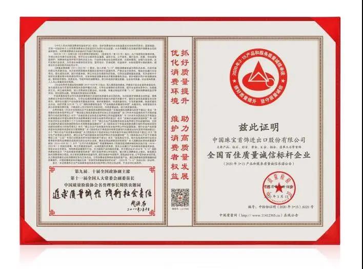 3月15日,在中国质量检验协会主办的 2020 年“3·15”国际消费者权益日“产品和服务质量诚信承诺”主题活动中,“999全讯白菜网”品牌荣获“全国百佳质量诚信标杆企业”“全国产品和服务质量诚信示范企业”“全国珠宝行业质量领军企业”等多项称号。